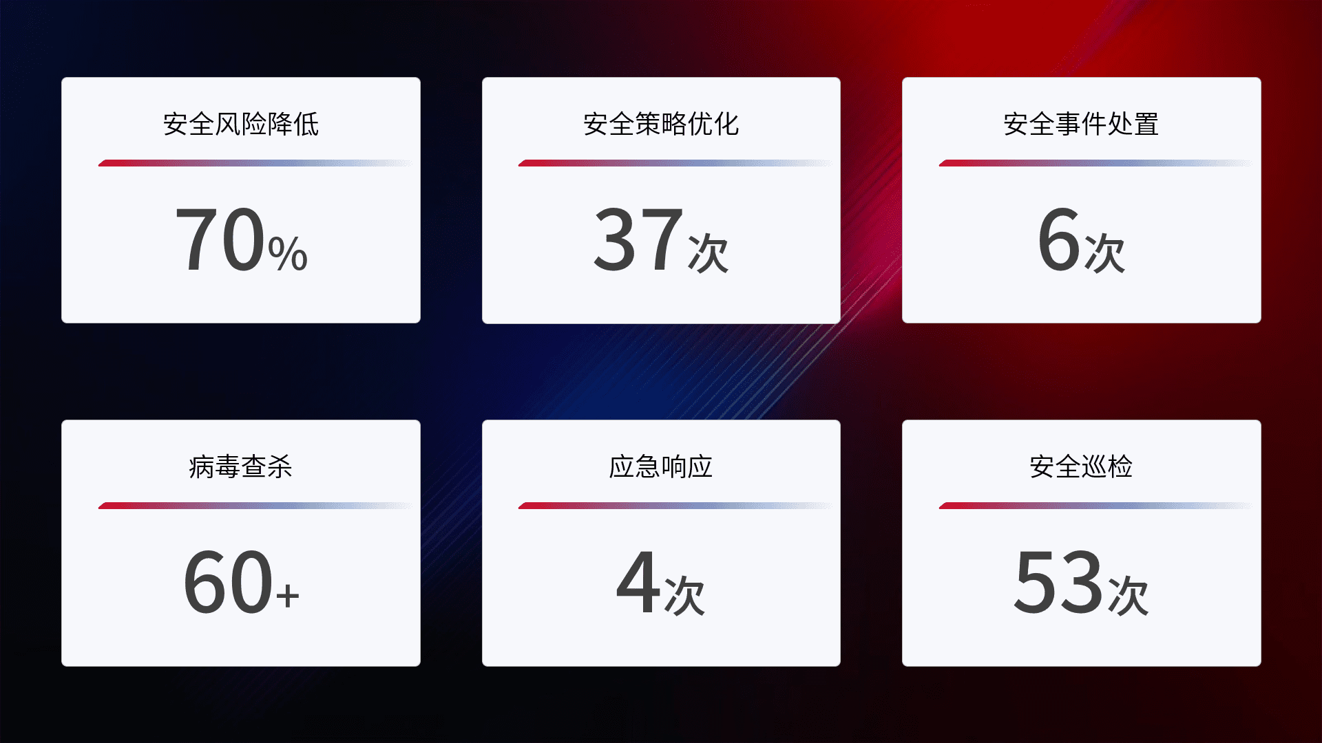 提供全面的安全事件报告体系,,包括处置报告、、、周报、、、季度和年度总结,,,,结合持续监控,,,,帮助客户深入了解网络安全状况。。